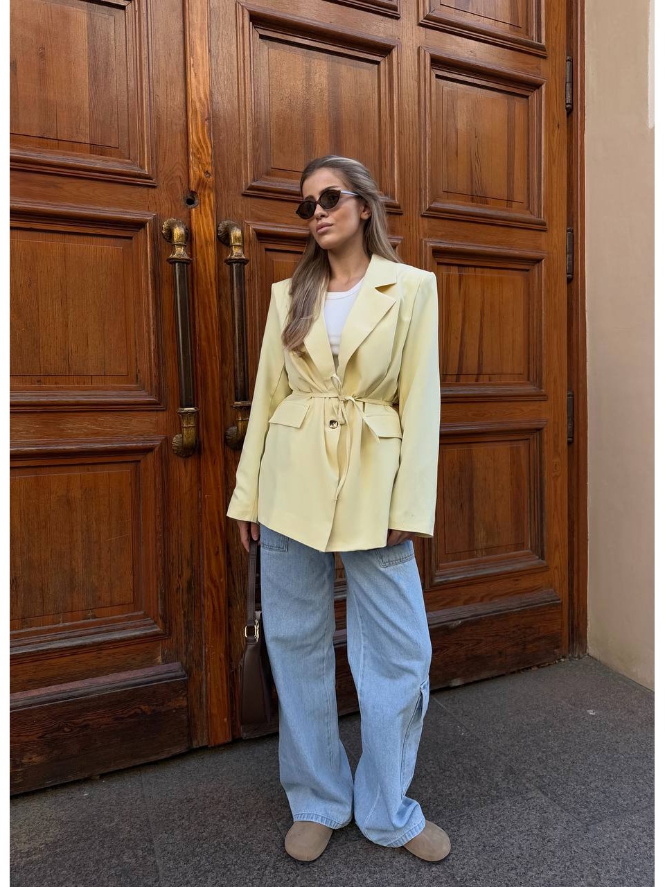 Жіночий піджак з поясом жовтого кольору 34649