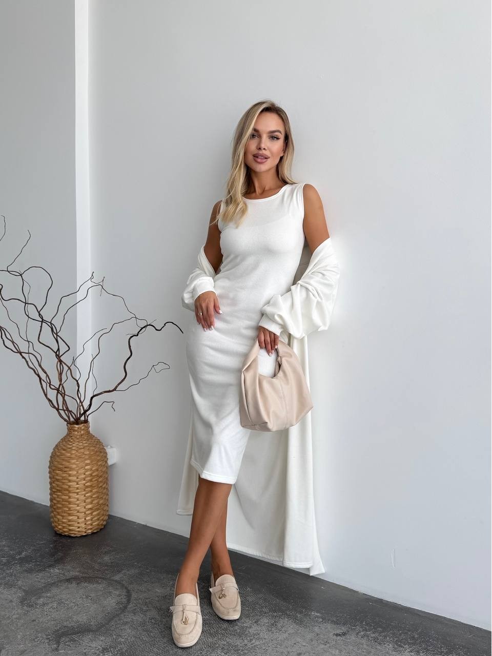 Жіночий теплий костюм кардиган+сукня молочного кольору 34890