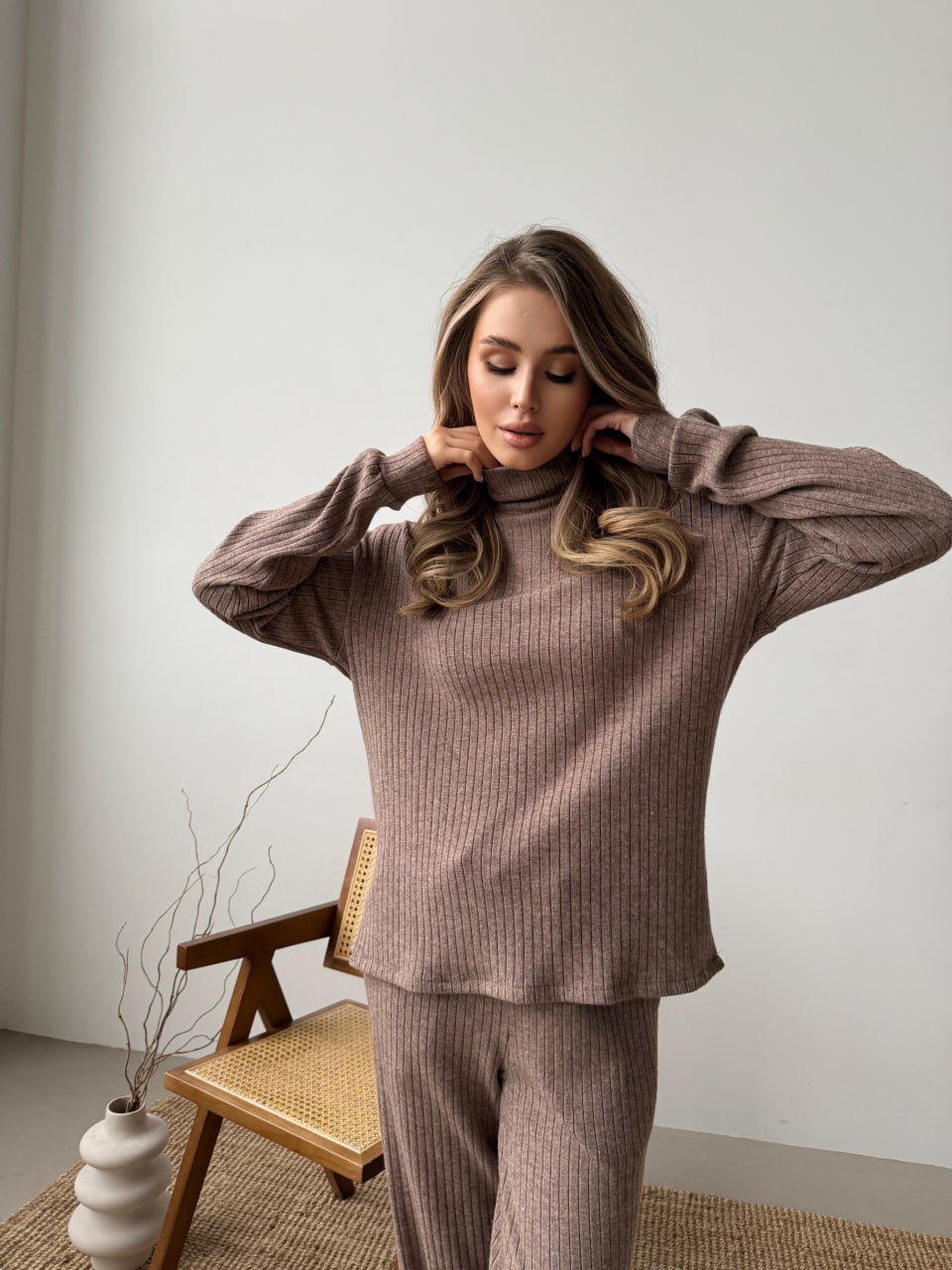 Жіночий в'язаний костюм кавового кольору 34489