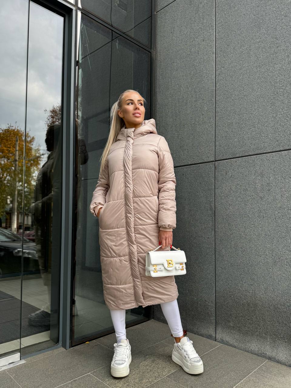 Жіноче зимове пальто-пуховик бежевого кольору 35218