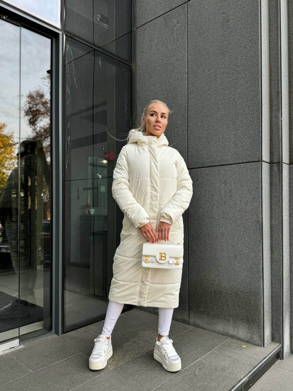 Жіноче зимове пальто-пуховик молочного кольору 35217