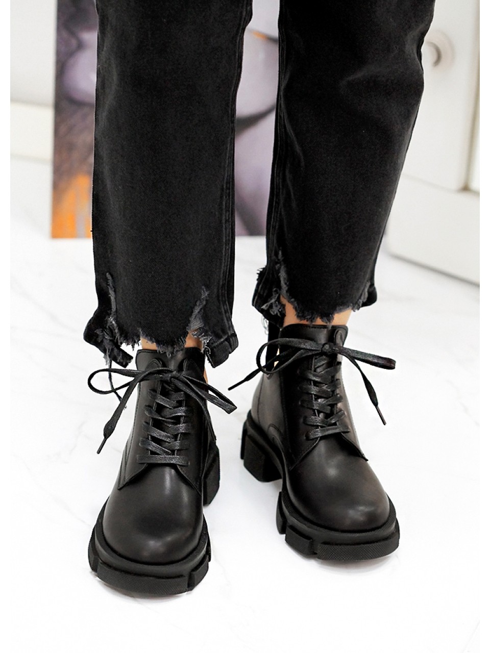 Жіночі шкіряні черевики на шнурівці чорного кольору 34896