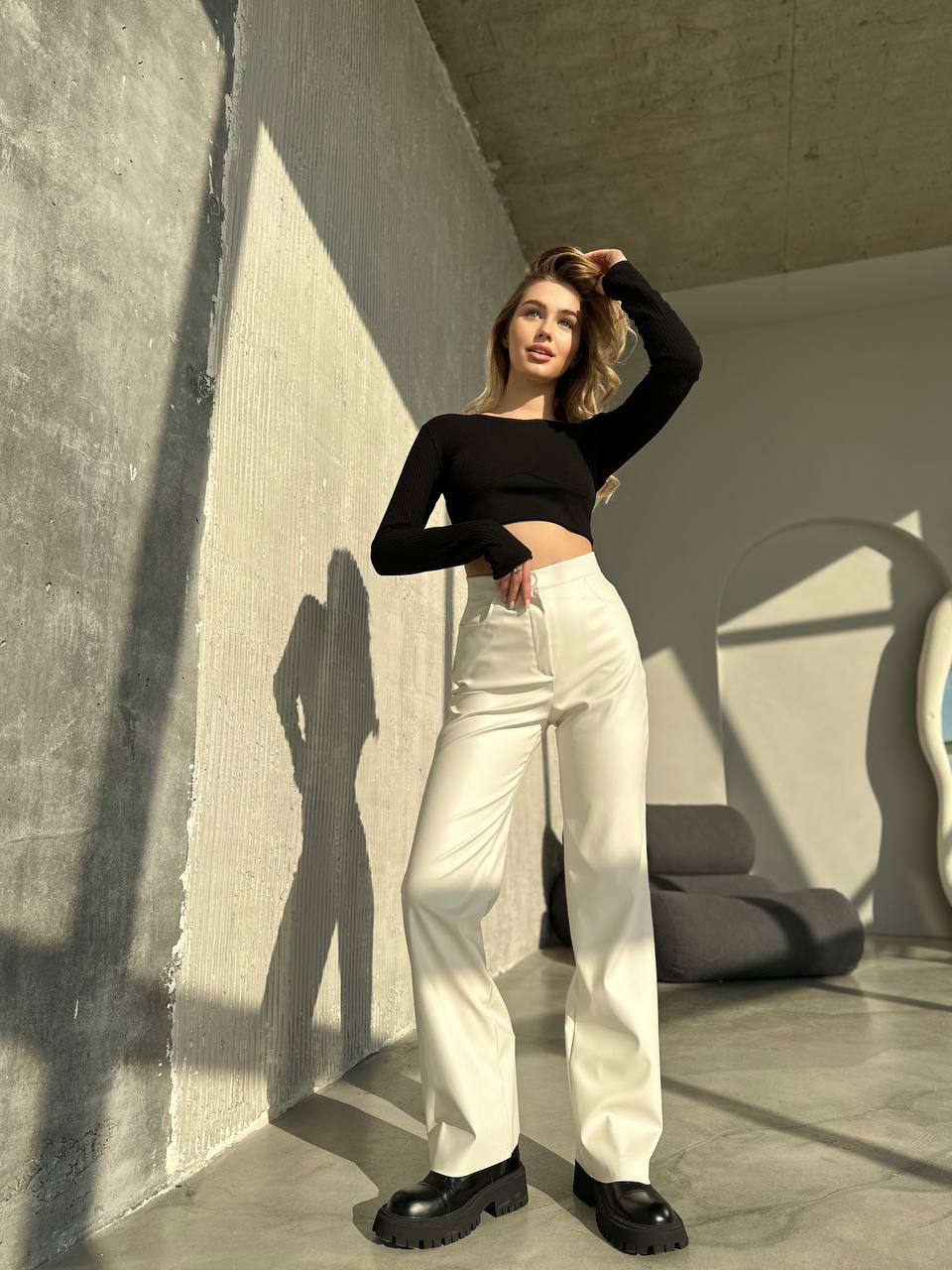 Жіночі штани з еко-шкіри молочного кольору 34205
