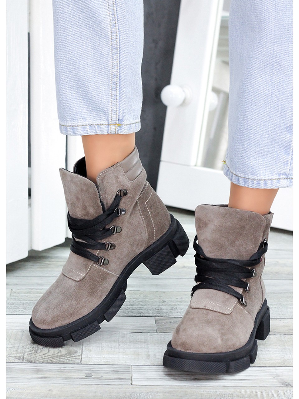 Жіночі замшеві черевики трапери (хутро) кольору лате 34830