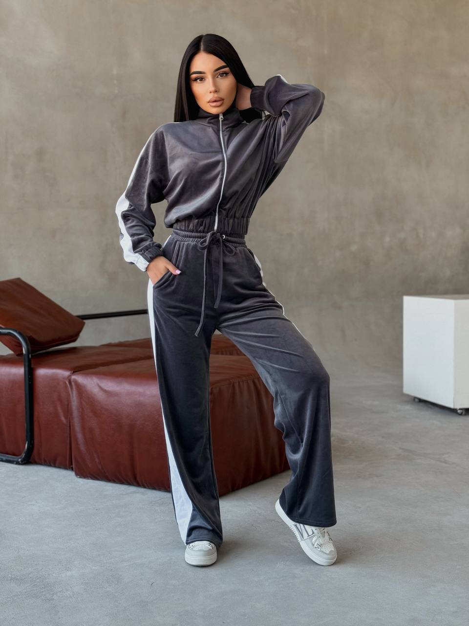 Жiночiй велюровий костюм з лампасами графiтового кольору 34477