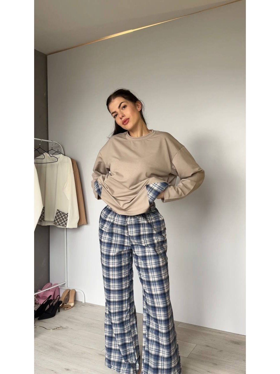 Жіночий домашній костюм в клiтину з бавовни синього кольору 35958