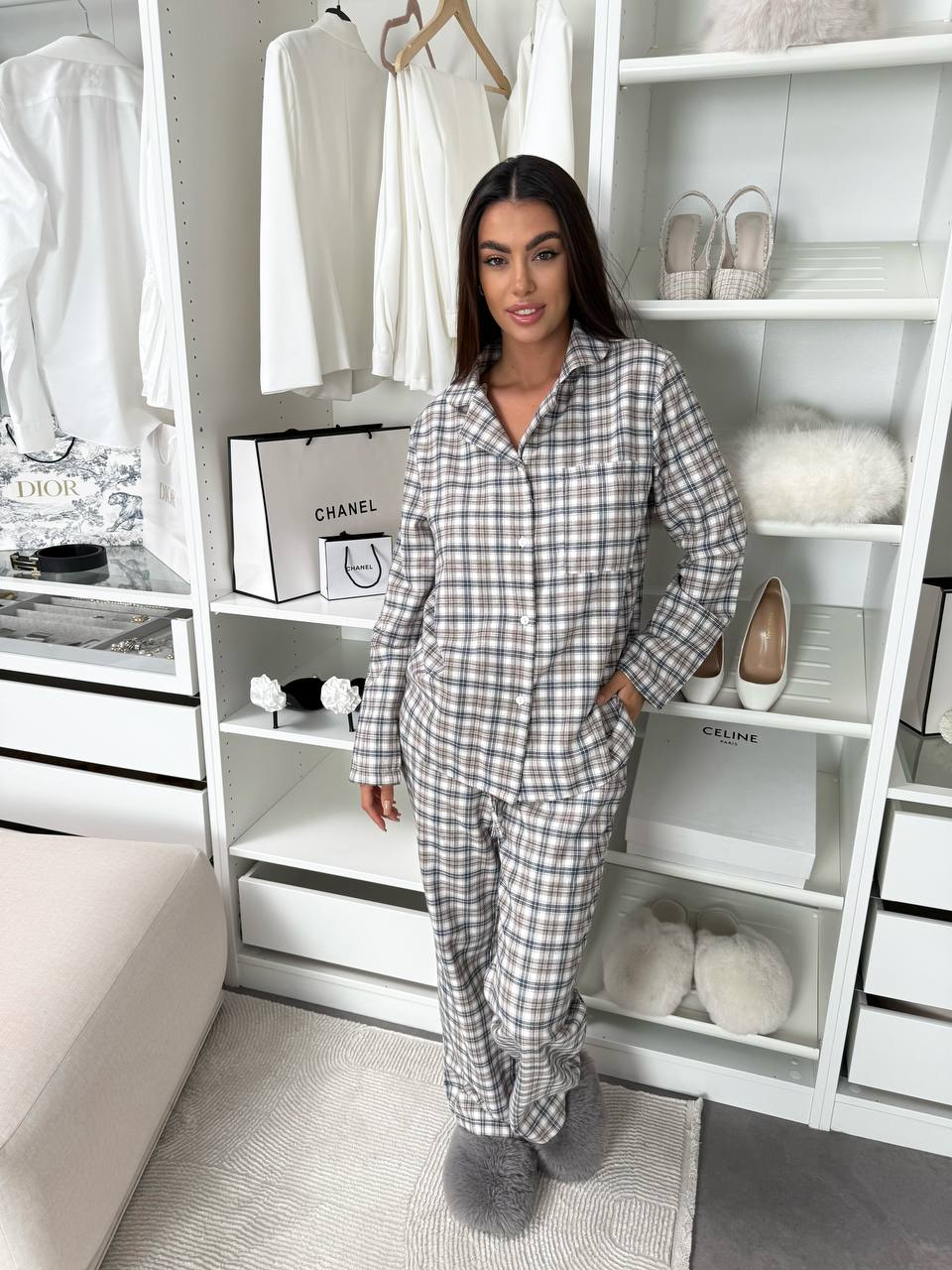 Жіночий домашній костюм в клiтину з фланелi сiрого кольору 35923