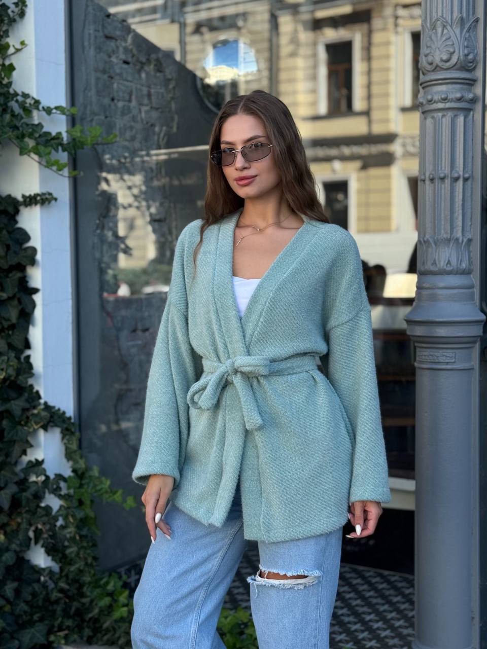 Жіночий кардиган iз альпаки з поясом м'ятного кольору 35234