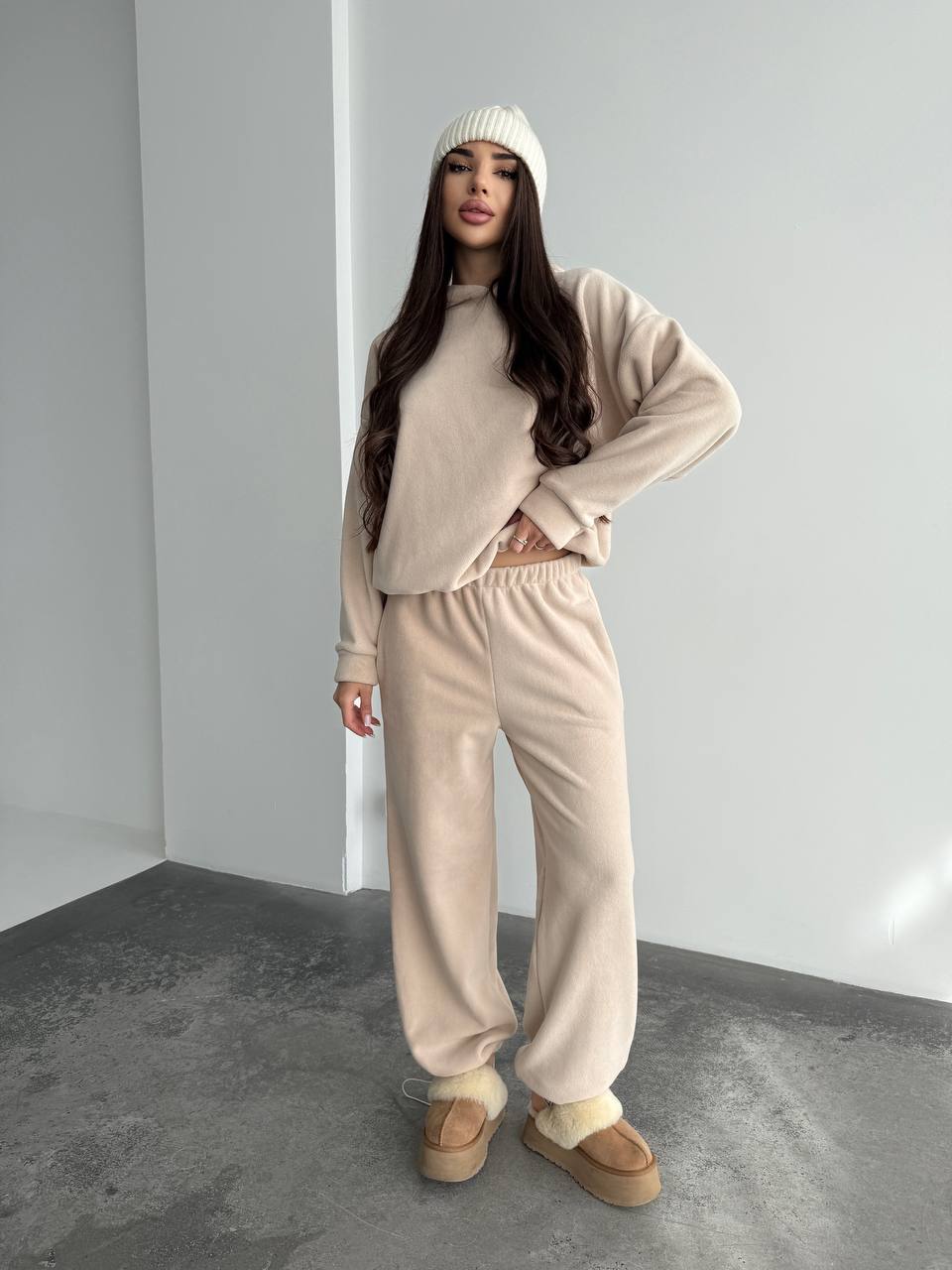 Жіночий костюм iз плюшевого флісу бежевого кольору 35717