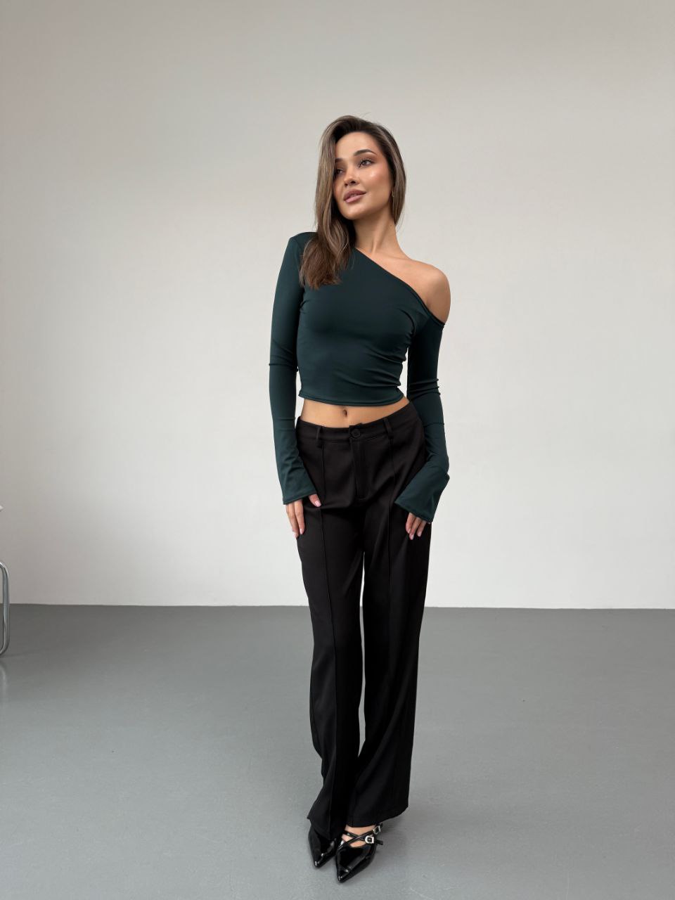 Жіночий легкий лонгслів на одне плече смарагдового кольору 35849
