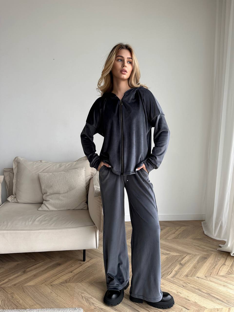 Жіночий теплий велюровий костюм графiтового кольору 35522
